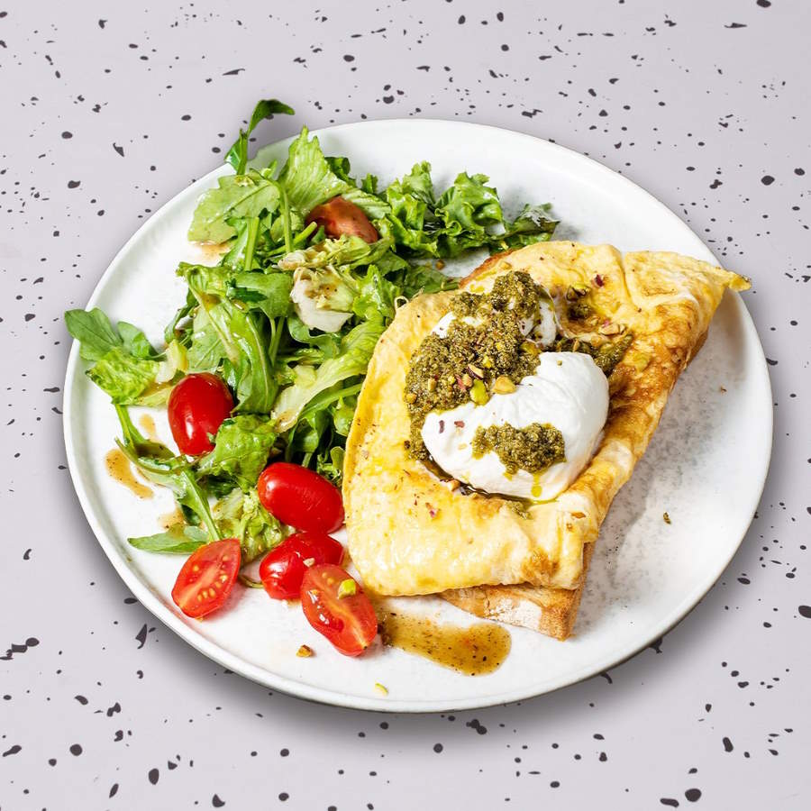 Φρυγανισμένο brioche, ζεστή burrata, αφράτη ομελέτα, σαλάτα, ντοματίνια, πέστο βασιλικού, θρυμματισμένο φιστίκι Αιγίνης, συνοδεύεται