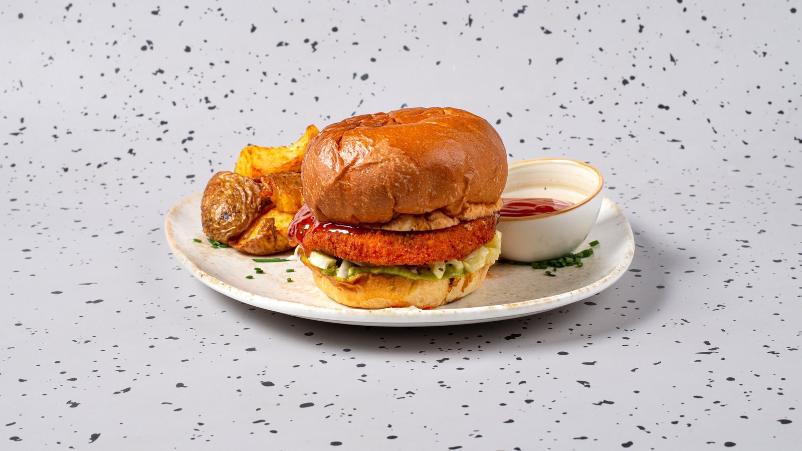 Brioche ψωμί, κοτόπουλο φιλέτο, τυρί cheddar, ντομάτα, spicy