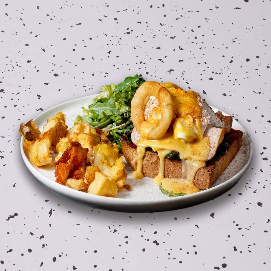 φρυγανισμένο brioche, αυγά ποσε, σπανάκι,hollandaise,τραγανά κρεμμύδια &πατάτες καρυκευμένες